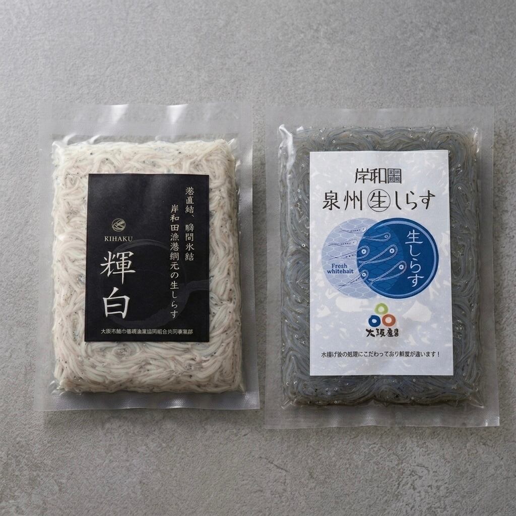スラリー瞬間凍結 輝白 -KIHAKU- 200gと氷締め生シラス 白 -HAKU- 200g、合計400gのお試しセット。